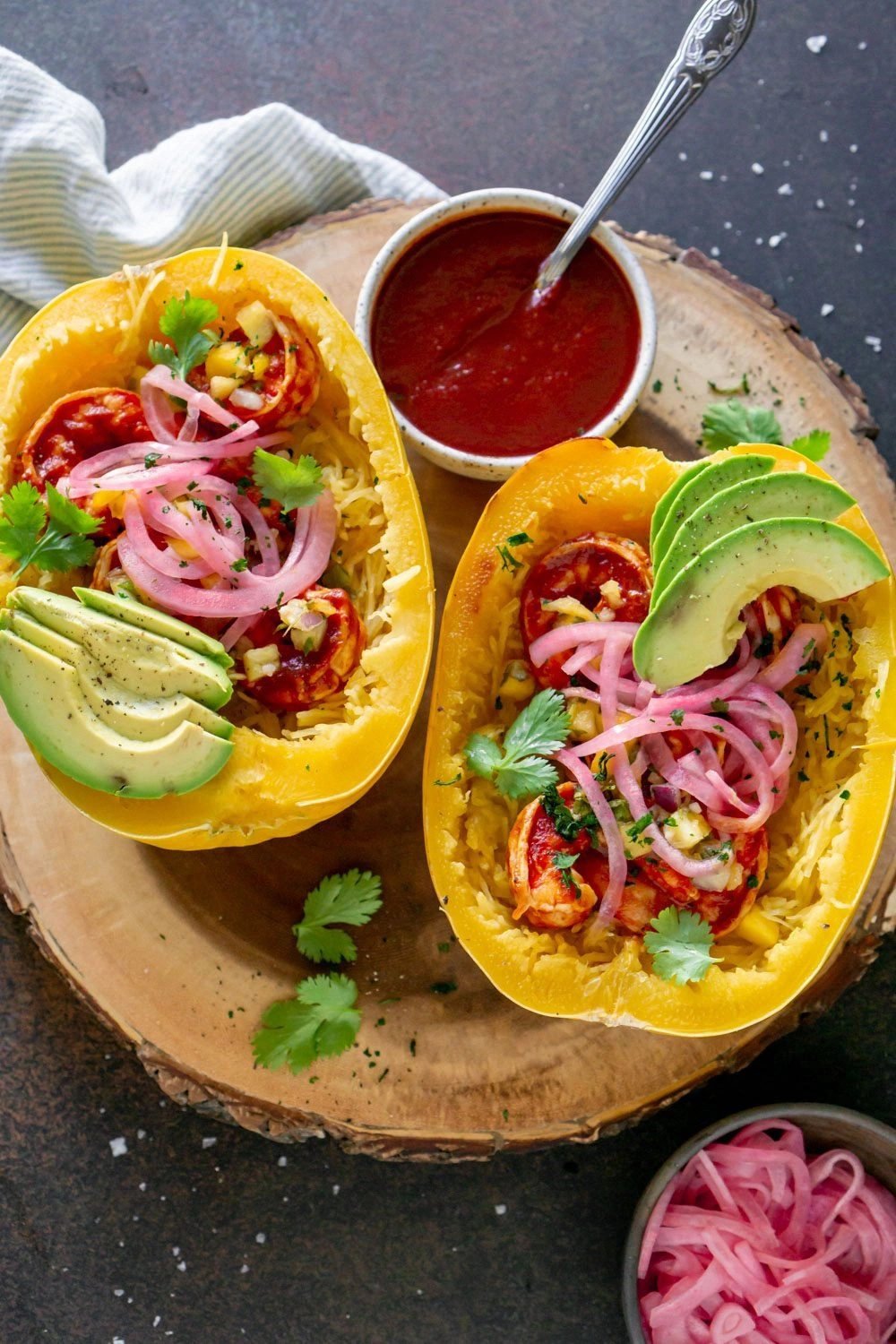 - Texture Play: The spaghetti squash is roasted to a perfect crisp on the edges and silky inside, giving a satisfying bite that contrasts with the firm shrimp and crunchy pickled onions.