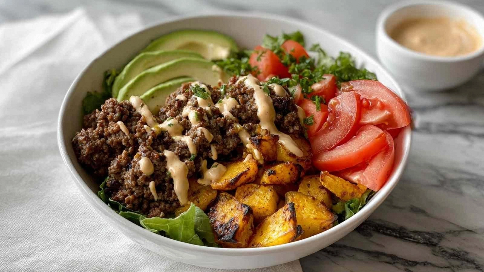 There’s a secret ingredient that most people overlook—a creamy yogurt sauce that coats the potatoes like velvet, giving each bite a burst of tang that cuts through the richness of the beef. And the way the avocado slices sit on top, their buttery texture melting into the bowl, adds a layer of decadence that feels both luxurious and comforting. Picture yourself pulling this out of the oven, the whole kitchen smelling incredible, and knowing you’ve just created the best version of a burger bowl you’ll ever make at home. Let me walk you through every single step—by the end, you’ll wonder how you ever made it any other way.