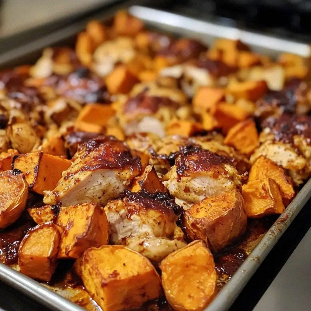 - Bake for an additional 10–12 minutes, or until the chicken reaches an internal temperature of 165°F (74°C). The sauce should be thick and sticky, and the sweet potatoes should be golden brown.