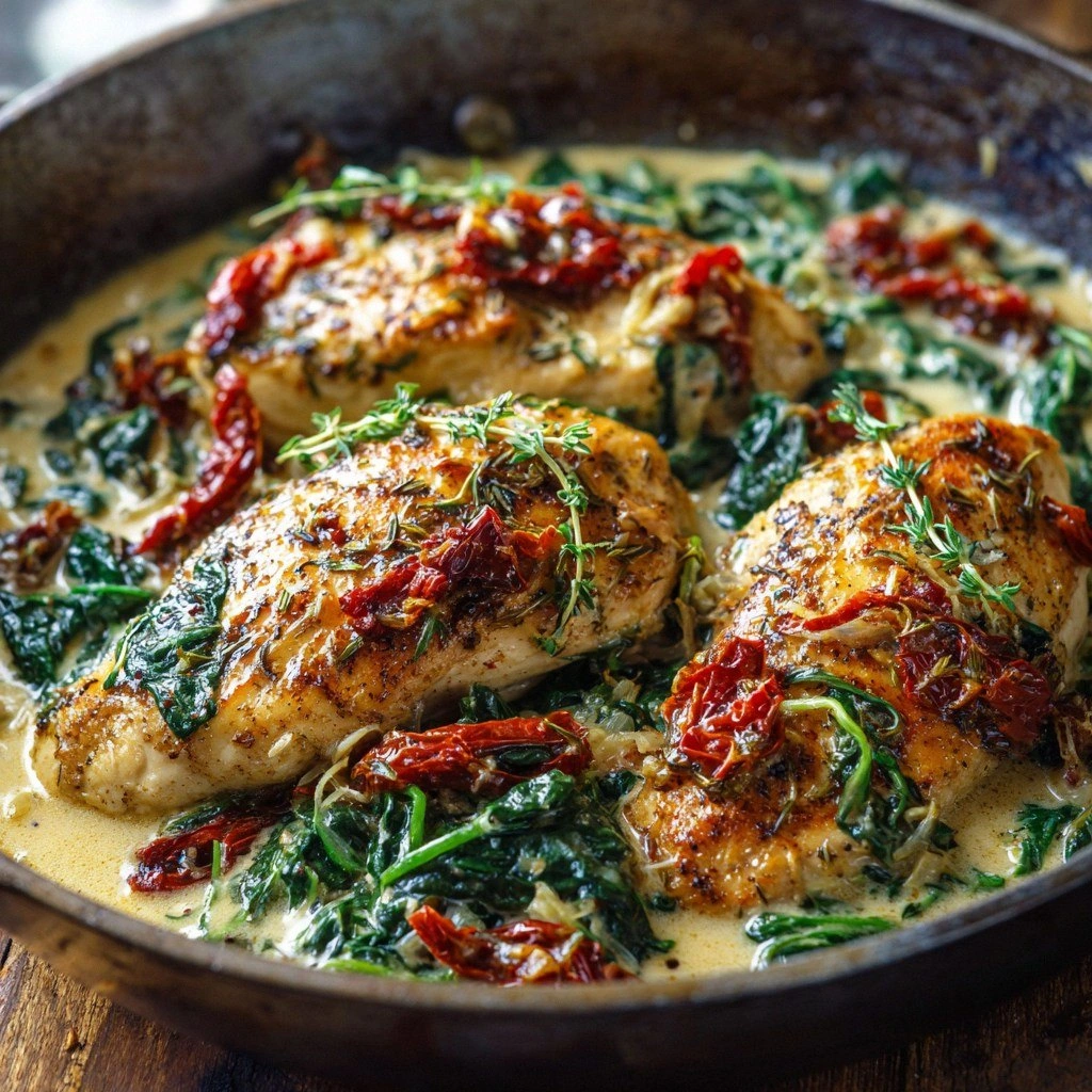 Most Tuscan chicken recipes I’ve tried have been either too dry or too heavy, but this one hits the sweet spot where every element sings in harmony. The secret lies in the use of sun‑dried tomatoes packed in olive oil, which infuse the sauce with a deep, almost smoky sweetness that you can’t get from fresh tomatoes alone. I also use a splash of heavy cream and a generous handful of Parmesan, creating a sauce that is luxuriously creamy without being cloying. The finish with fresh spinach not only adds a pop of color but also a subtle earthiness that balances the richness. And the best part? This dish can be made in a single skillet, saving you from the dreaded cleanup that follows a multi‑pot meal.
